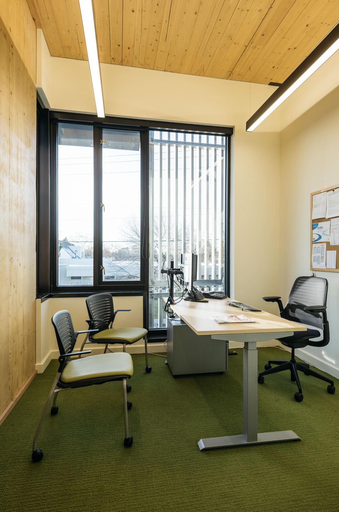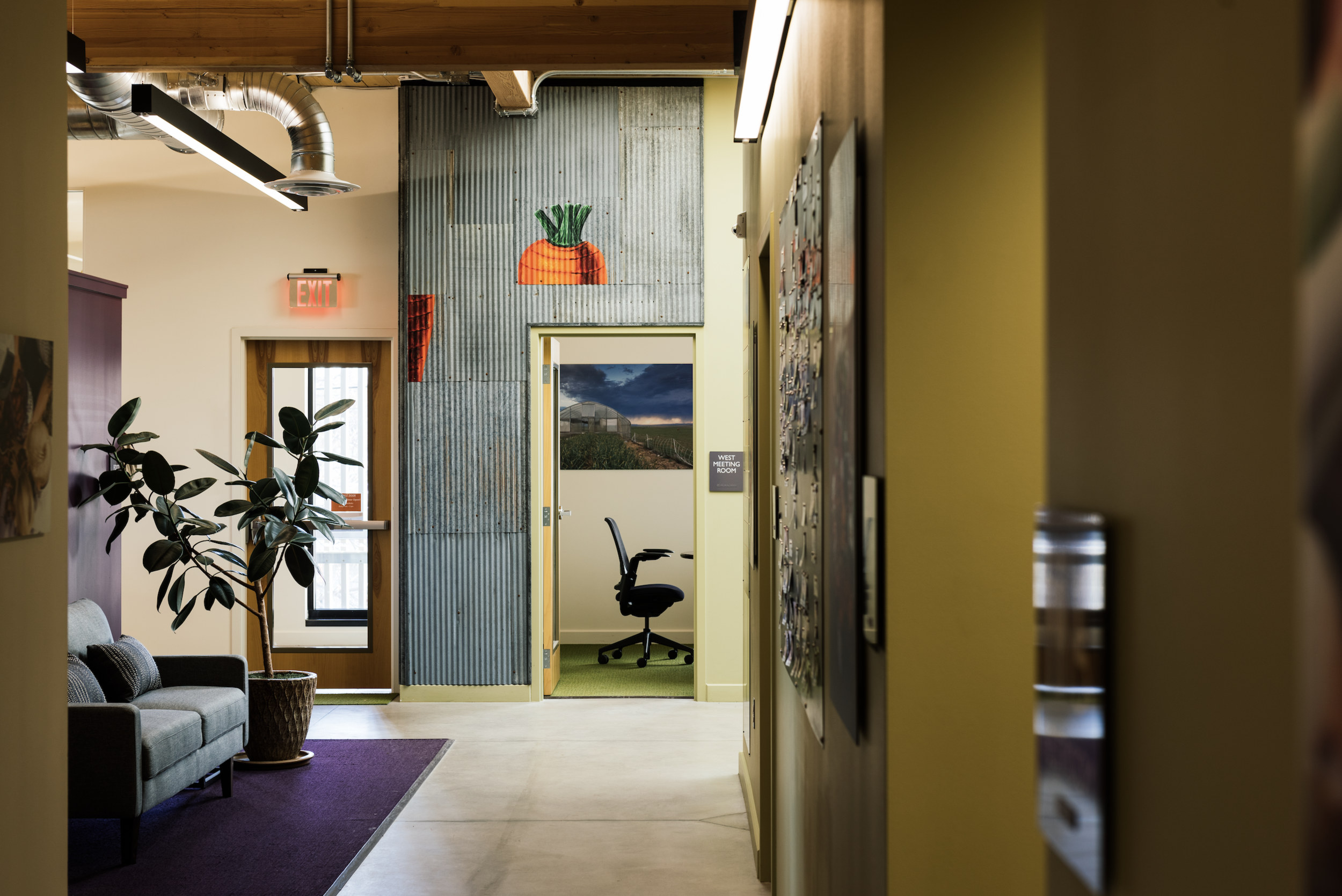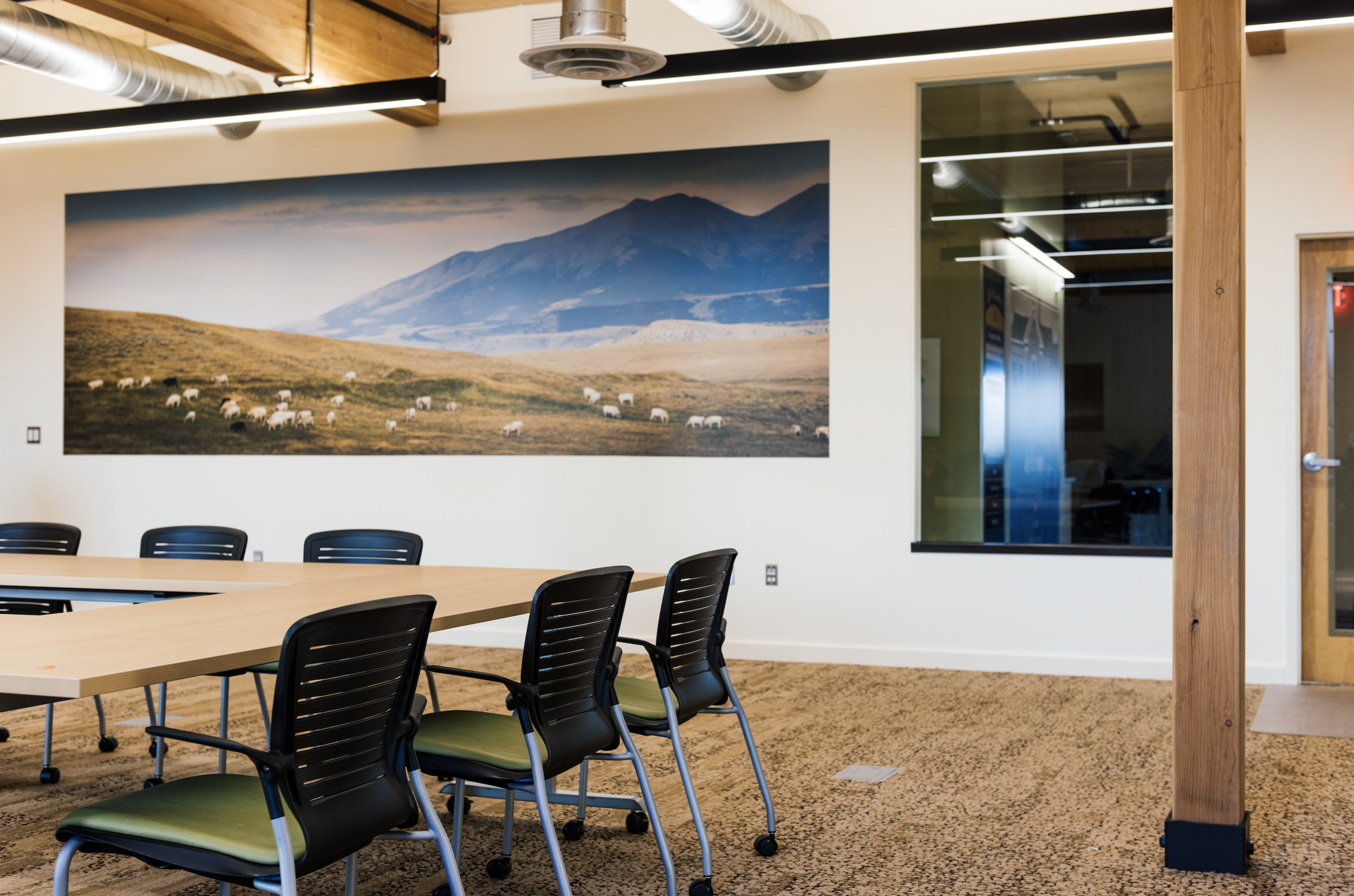 The Community Food Co-op is an independent community-owned grocery store located on West Main ST in Bozeman MT. In 2019 the store was updated and an addition was added to nearly double the size. Eleven Eleven design studio was hired by Comma-Q Architecture to assist in the selection of finishes & furniture for the second floor which houses all the Co-ops offices and meeting rooms. The goal for the interior was to create a calm, simple and creative workspace that allows all the support staff to work comfortably in one space. The interior feels professional but has a warm, casual feel created through the use of carefully selected materials; natural concrete floors, carpeted areas have a dynamic carpet; mixing organic textures and colors borrowed from nature. Wood ceilings, walls and cabinets add warmth to the space. The paint palate, pulled from the surrounding environment, includes a crisp white with accent colors of green, blue, orange and yellow. At each entrance is an art wall made from recycled galvanized metal taken from the original building. Furniture, integrates height adjustability with built in power & data at each workstation to support staff in an open office environment.